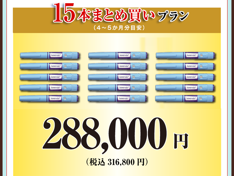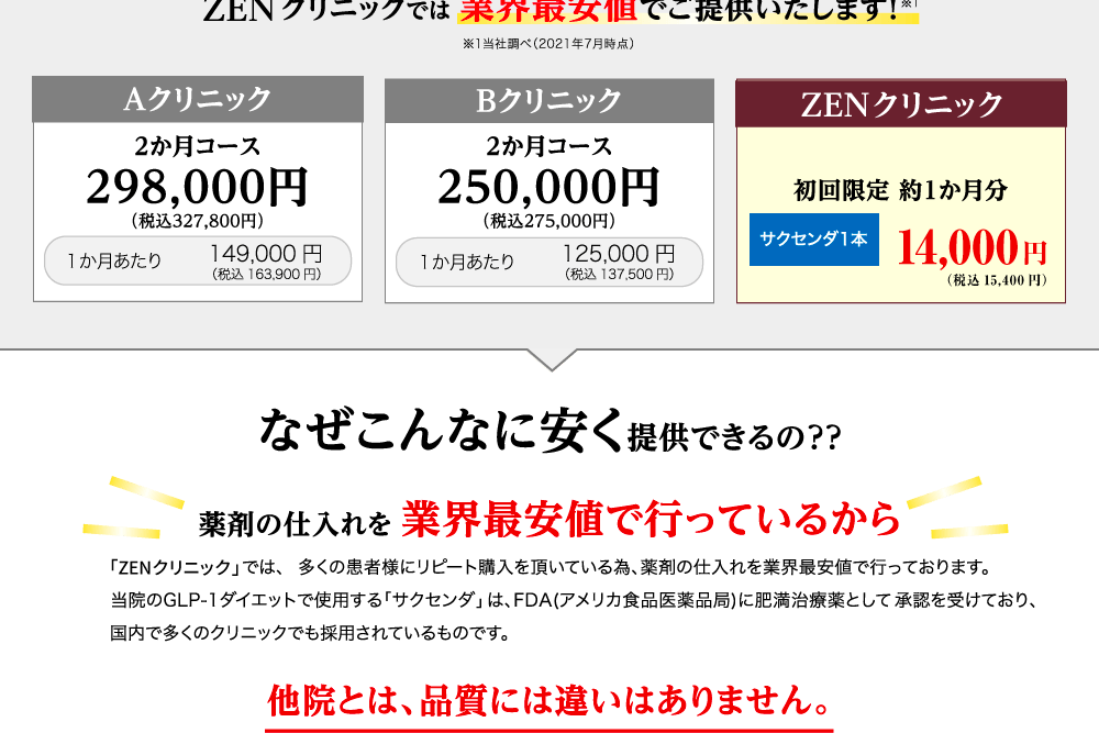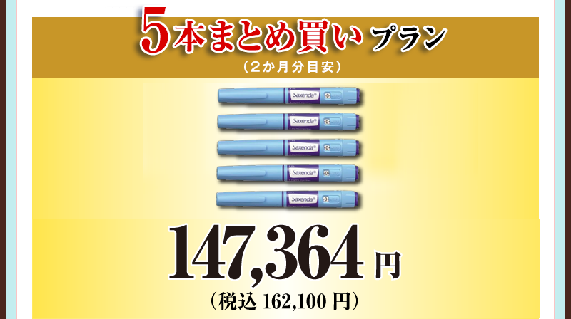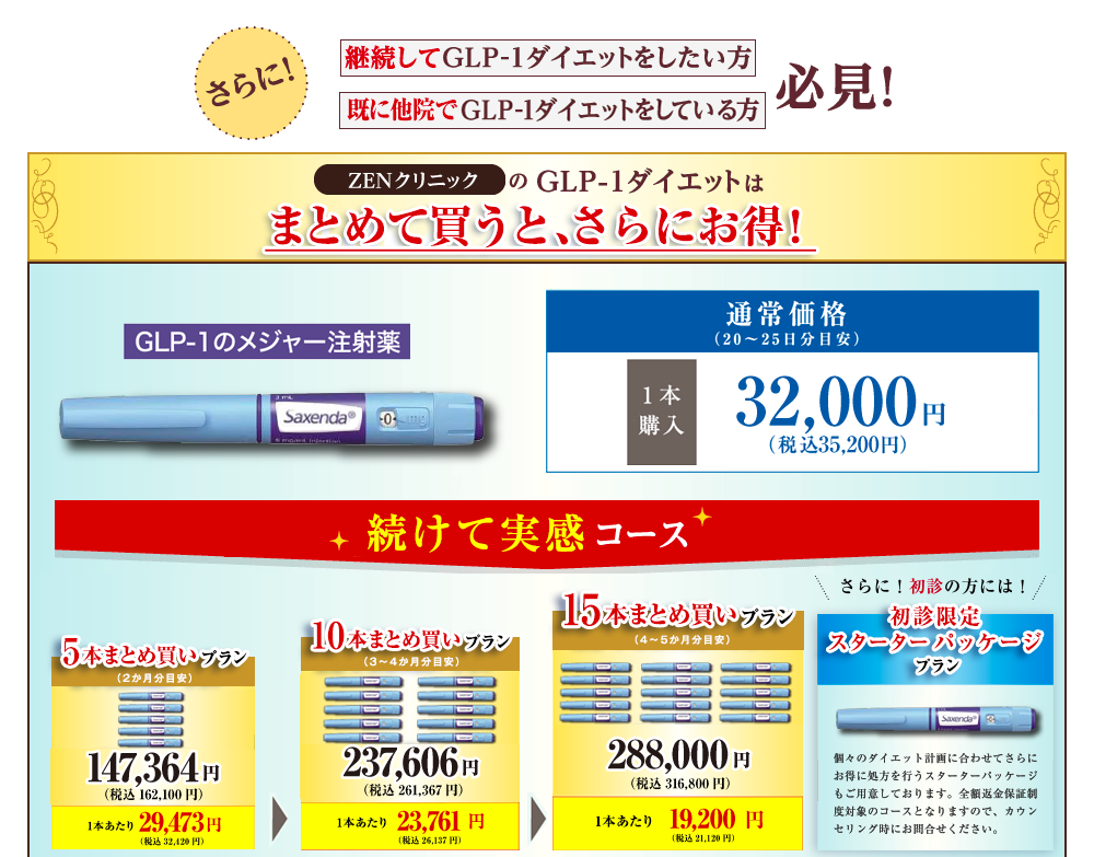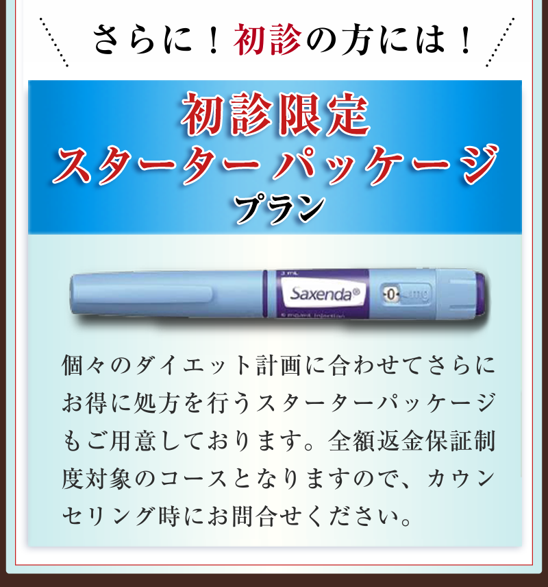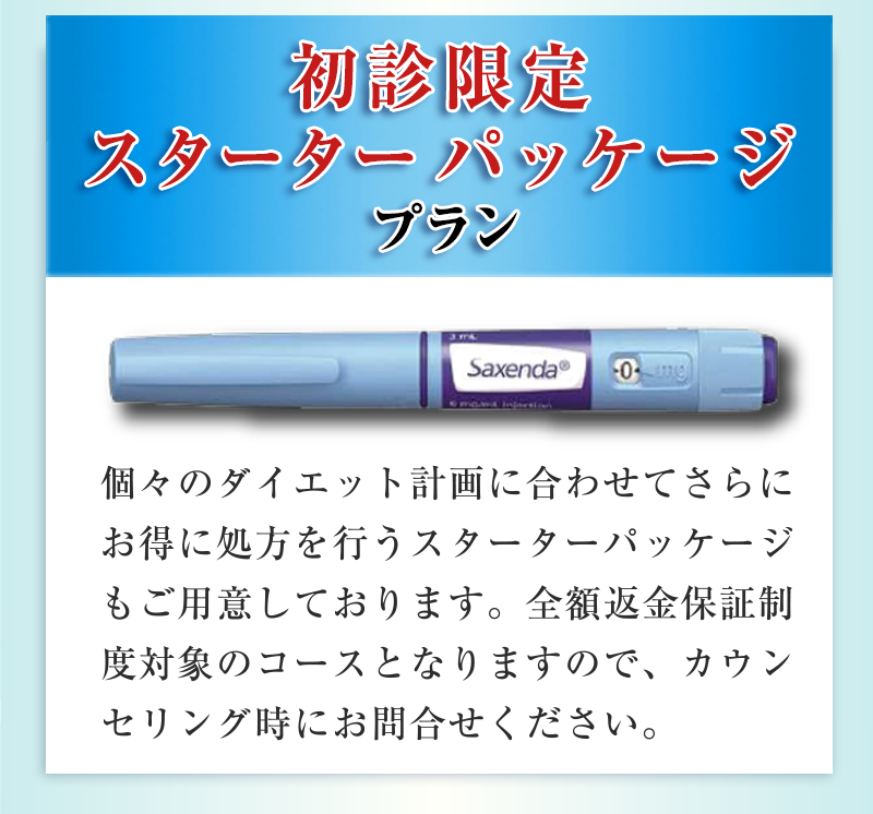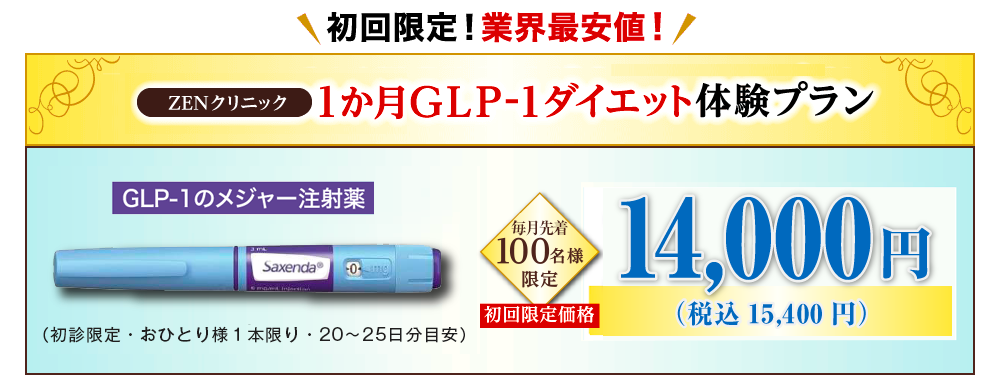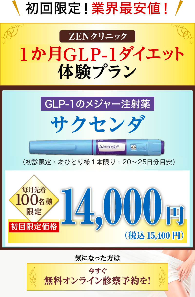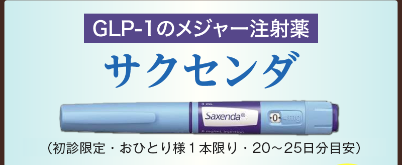 ※当院は完全自費診療(保険外診療です)※表記の値段は、初回治療薬(サクセンダ1本)の価格です。※初回オンライン診療費3,300円(税込)、薬剤送料1,100円(税込)【沖縄・離島は送料1,650円】、備品代(専用針・アルコール綿等)3,300円(税込)が別途かかります。※問診・診察の結果により、血液検査を行って頂く場合がございます。※当院で血液検査を行う場合は別途4,290円(税込)の費用がかかります。※サクセンダの場合は体型や目標プランで、日数が変動する場合があります。※GLP-1ダイエットの初回限定価格は、症例を集める事を目的とした特別価格です。必ず再診を受けて頂く事を条件とさせて頂きます。万が一、決められた期間内に再診を受診されない場合は、通常価格との差額をお支払い頂く事になりますので、その旨ご了承ください。また初回限定価格は、全額返金保証制度の対象外となります。