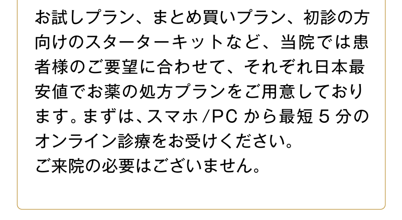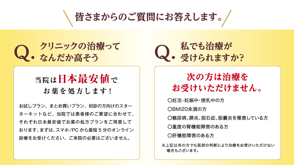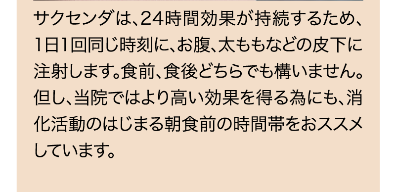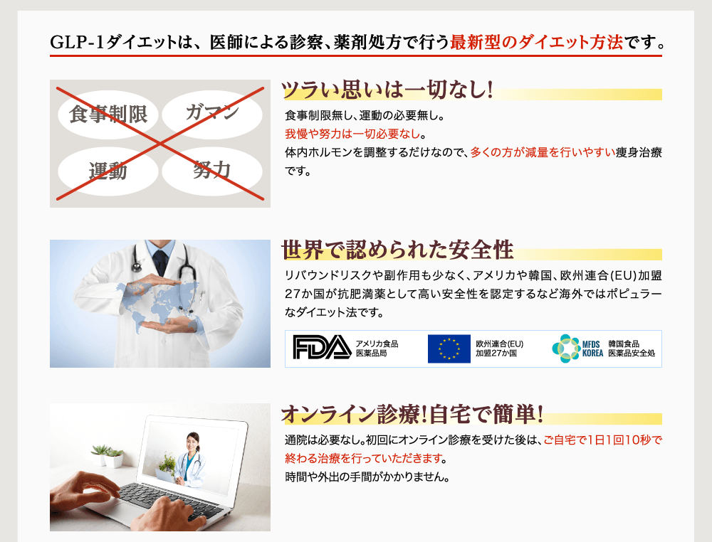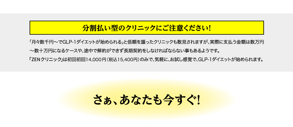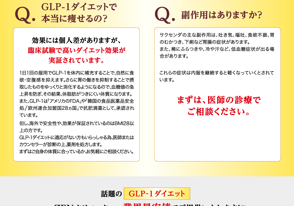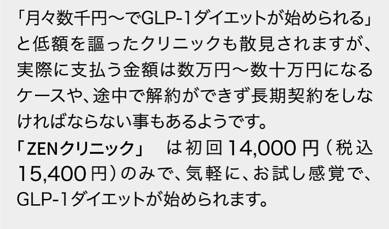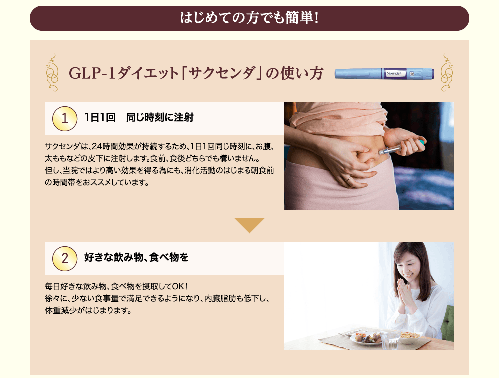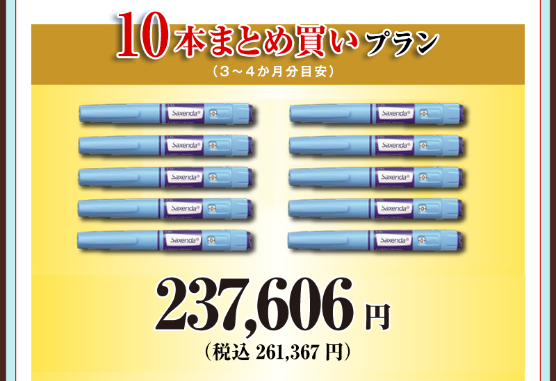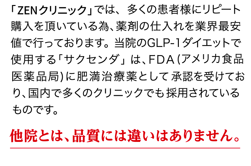 ※当院は完全自費診療(保険外診療です)※表記の値段は、初回治療薬(サクセンダ1本)の価格です。※初回オンライン診療費3,300円(税込)、薬剤送料1,100円(税込)【沖縄・離島は送料1,650円】、備品代(専用針・アルコール綿等)3,300円(税込)が別途かかります。※問診・診察の結果により、血液検査を行って頂く場合がございます。※当院で血液検査を行う場合は別途4,290円(税込)の費用がかかります。※サクセンダの場合は体型や目標プランで、日数が変動する場合があります。※GLP-1ダイエットの初回限定価格は、症例を集める事を目的とした特別価格です。必ず再診を受けて頂く事を条件とさせて頂きます。万が一、決められた期間内に再診を受診されない場合は、通常価格との差額をお支払い頂く事になりますので、その旨ご了承ください。また初回限定価格は、全額返金保証制度の対象外となります。